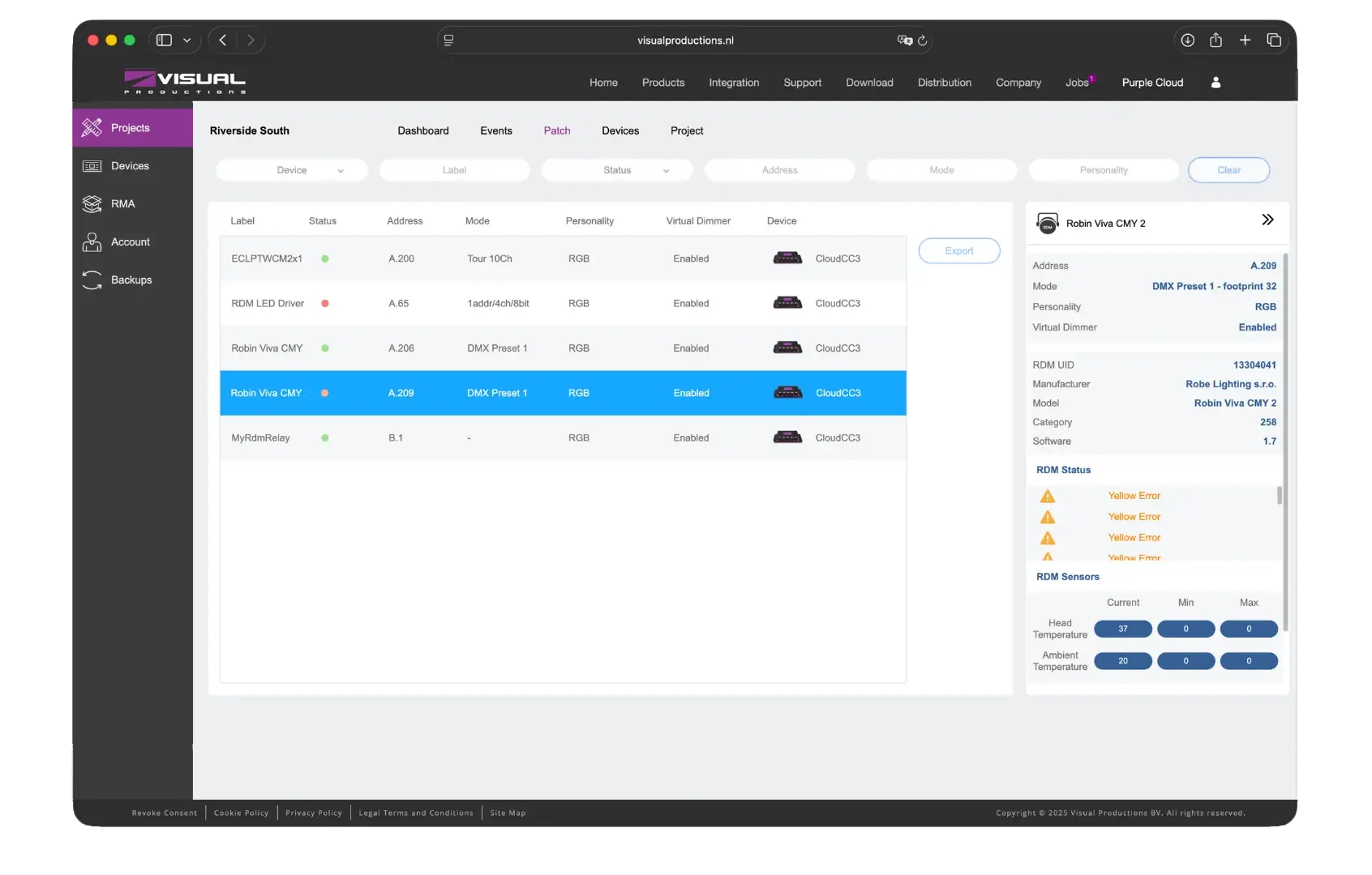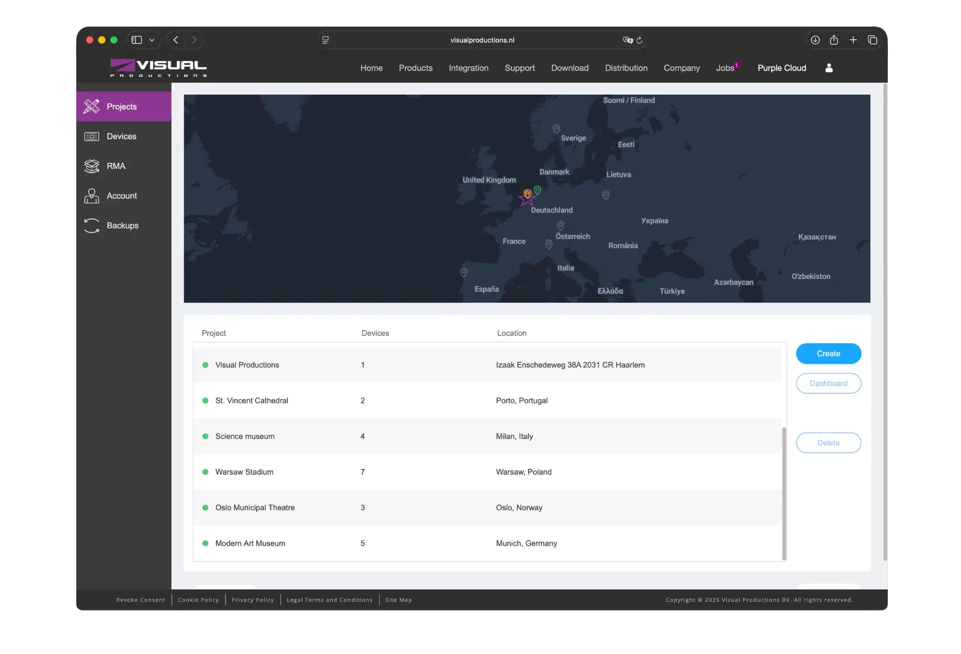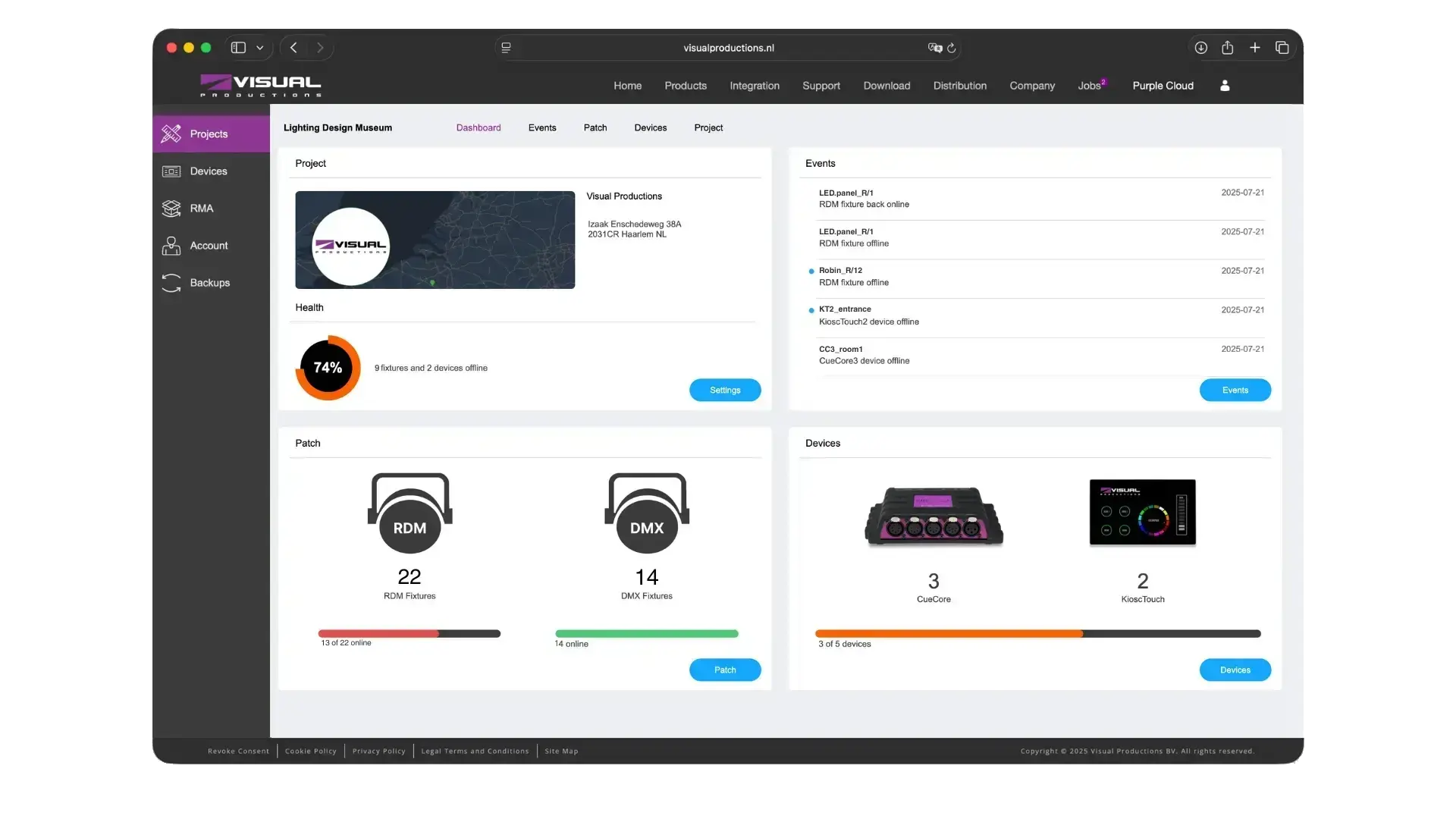 Systemy inteligentnego sterowania oświetleniem Visual Productions są teraz jeszcze bardziej inteligentne dzięki platformie Purple Cloud. To rozwiązanie chmurowe łączy kontrolery oświetlenia na całym świecie, umożliwiając łatwy zdalny dostęp i zarządzanie.