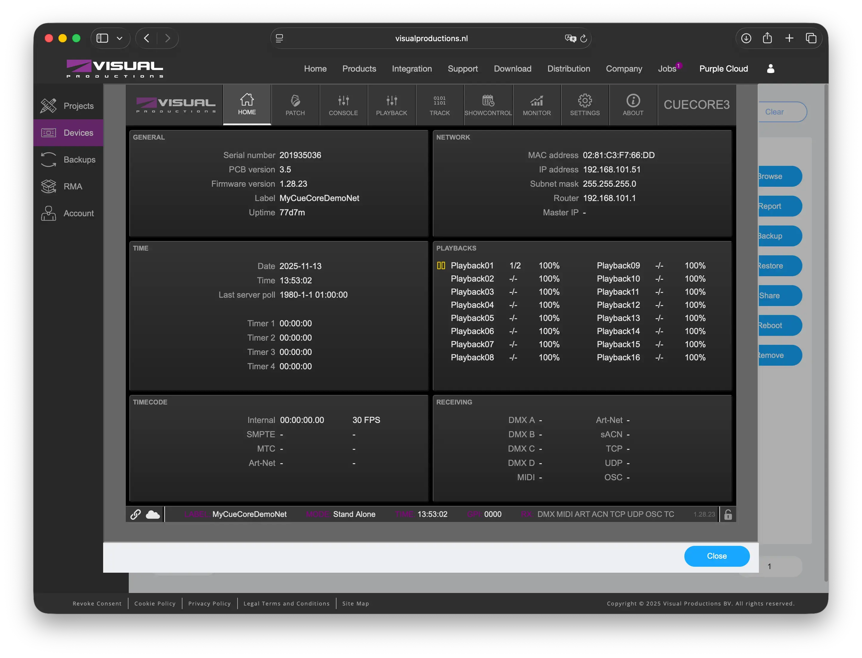 Z łatwością monitoruj swój system oświetleniowy Visual Productions, aby szybko reagować w przypadku problemów lub zmian planów. Platforma Purple Cloud zapewnia wgląd w czasie rzeczywistym w czas pracy urządzeń, przychodzące i wychodzące komunikaty sieciowe, status odtwarzania, poziomy GPI oraz ustawienia urządzeń.