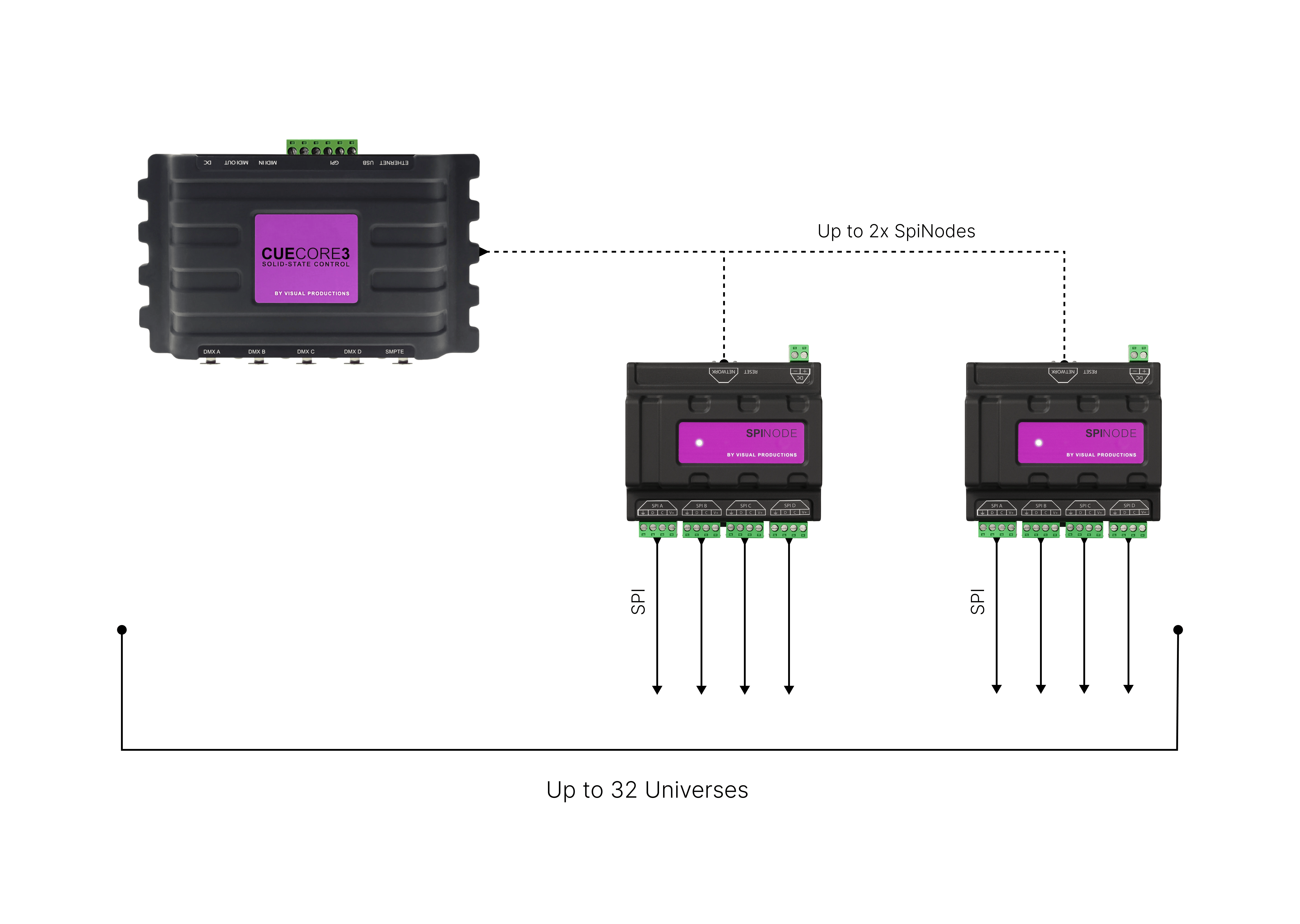 SpiNode może współpracować z kontrolerem CueCore3, znacznie rozszerzając jego możliwości. Po podłączeniu można uzyskać do 32 universów sterowania, co pozwala na zarządzanie rozbudowanymi instalacjami pixelowymi i dużymi projektami LED.